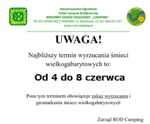 Kolejny raz przypominamy, że opony nie są śmieciami wielkogabarytowymi! Opony należy zawieźć i oddać do PSZOK. Nie zostaną one zabrane przez ProNaturę co będzie rodziło konieczność poniesienia dodatkowego kosztu po stronie wszystkich działkowców. Wzywamy zatem osobę/osoby które wyrzuciły opony o niezwłoczne ich zabranie. Przypominamy- teren parkingu i śmietników jest monitorowany. Zarząd ROD Camping