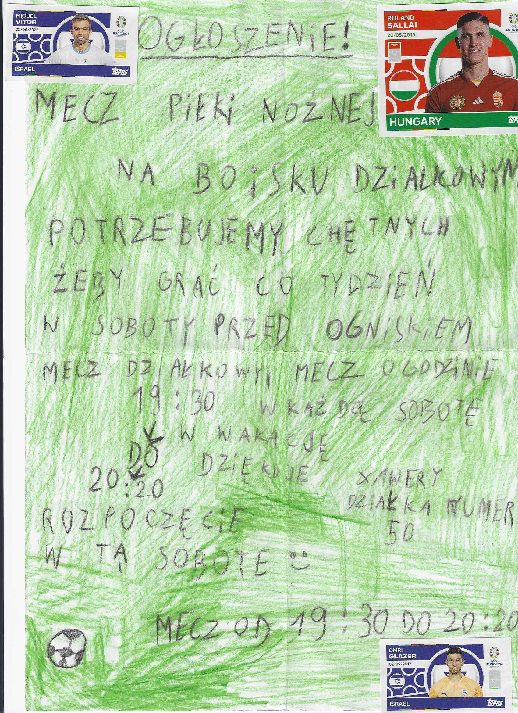 Młodzież ogrodu zaproponowała aby w każdą sobotę rozgrywać mecze piłkarskie na terenie naszego boiska o godzinie 19.30. Wszystkich zatem serdecznie zapraszamy i tych dużych i małych, tych co biegają bądź jedynie kucają 🙂 Zapraszamy serdecznie również kibiców 🙂 Obok zamieszczamy plakat jaki przygotował piłkarz Xawery z działki Nr 50. Zarząd ROD Camping