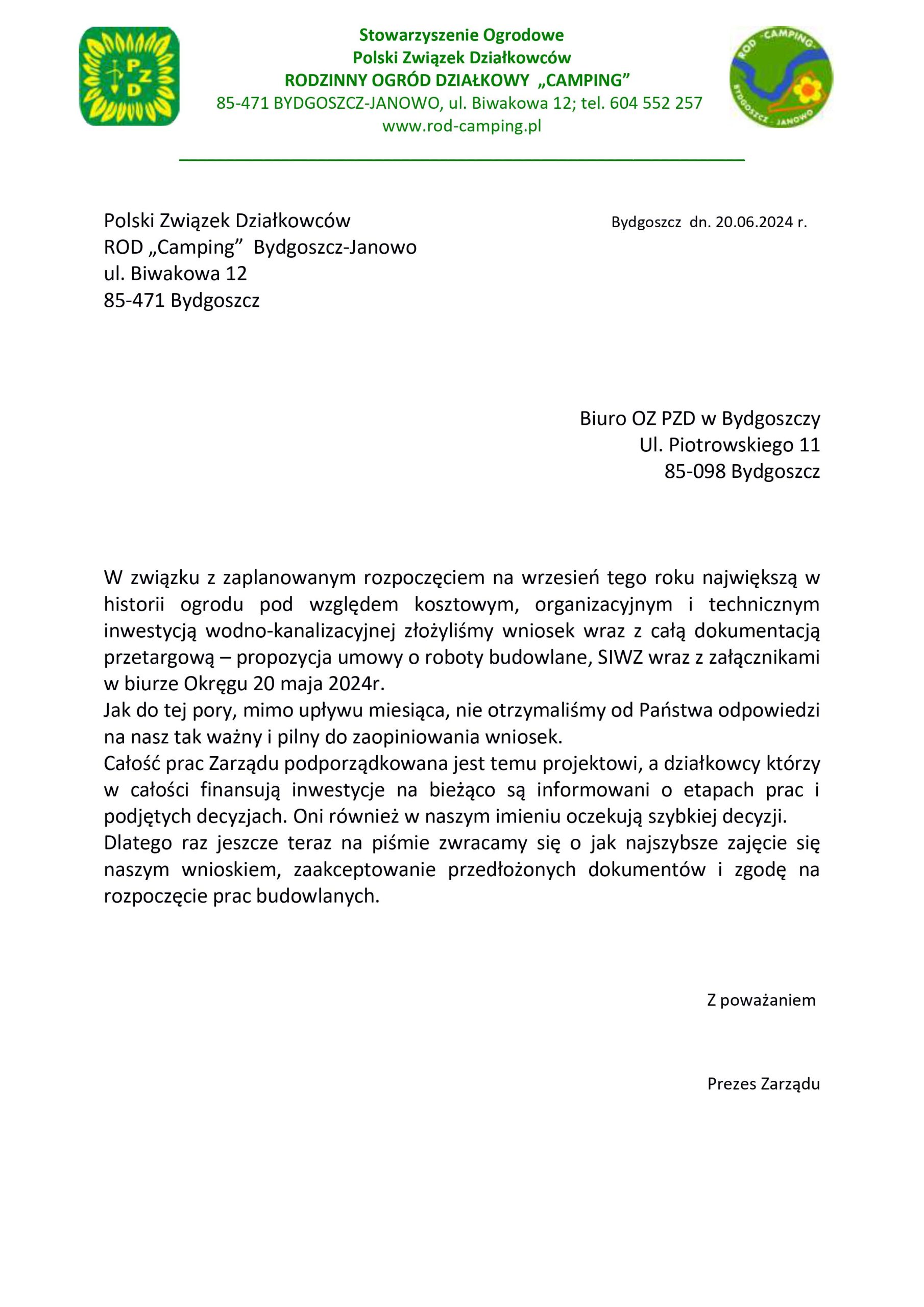 Cały czas nie możemy rozpisać przetargu na budowę sieci wodno-kanalizacyjnej ze względu na brak zgody Okręgowego Zarządu. Zwróciliśmy się zatem z pismem o priorytetowe potraktowanie naszego wniosku i jak najszybsze przeanalizowanie przedłożonych dokumentów. Wszystkie nasze działania były i są podporządkowane temu celowi między innymi bardzo wcześnie zwołane walne zebranie w miesiącu kwietniu, które przyjęło istotne uchwały związane z tą inwestycją. Zarząd ROD Camping