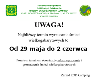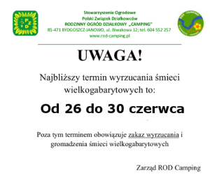 Prosimy i jednocześnie przypominamy, iż niedziele i dni świąteczne są dniami w których odpoczywamy i nie zakłócamy ciszy np. kosząc trawę, szlifując czy używając innych narządzi elektrycznych. Zarząd ROD Camping