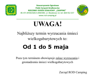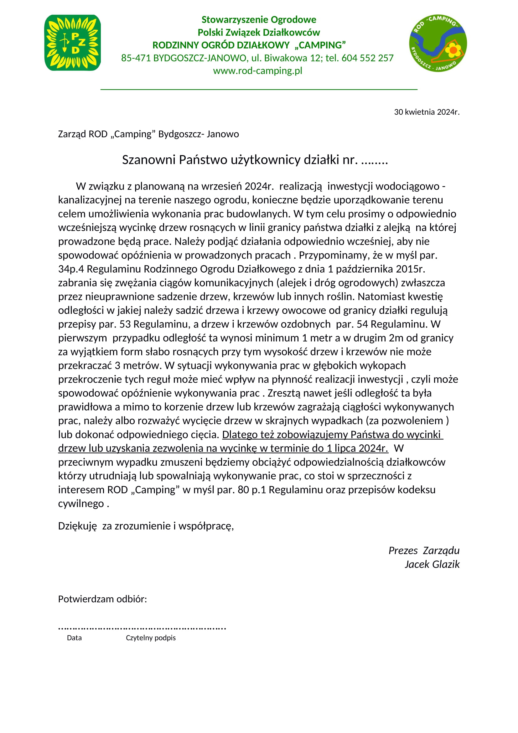 W związku z planowaną na wrzesień inwestycją wodno-kanalizacyjną zwracamy się do działkowców z pismem zobowiązującym do wycinki drzew lub uzyskania stosownego pozwolenia na wycinkę w terminie do 1 lipca. Mogą być one powodem wstrzymania lub opóźnienia w realizacji inwestycji. W przypadku nie wypełnienia tego obowiązku zrealizuje go Zarząd obciążając kosztami działkowca. Pismo które zamieszczamy obok na stronie przekazywane będzie przez powołaną między innymi do tego celu Komisję Regulaminową.  Zarząd ROD Camping