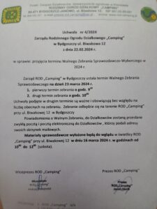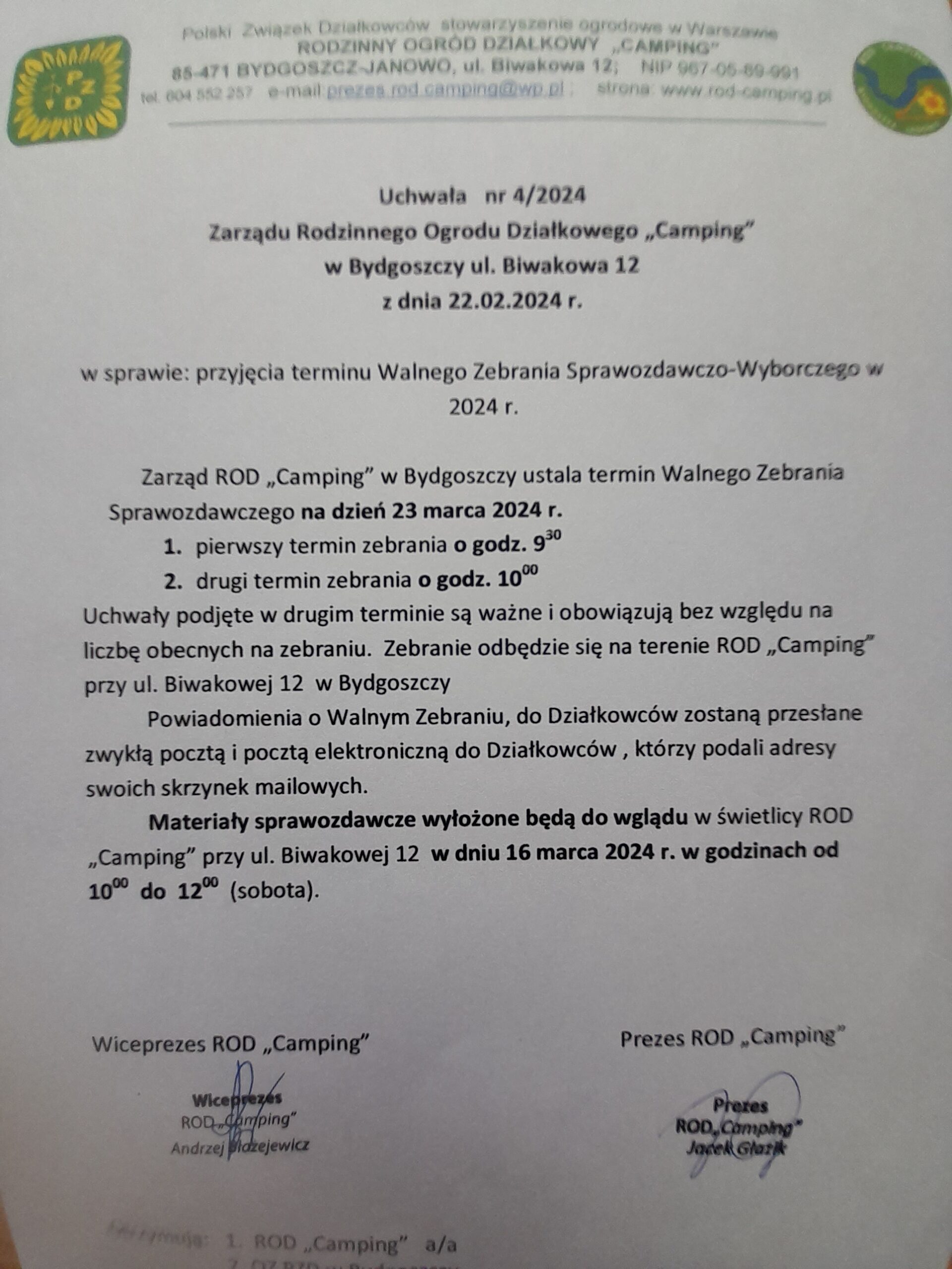 W dniu wczorajszym Zarząd pojął uchwałę o terminie Walnego Zebrania Sprawozdawczego- Wyborczego. Jednym z punktów obrad będzie wybór członków do nowego Zarządu ROD i Komisji Rewizyjnej. Odbędzie się ono w świetlicy ogrodu 23 marca – sobota w pierwszym terminie o godz. 9.30 i drugim o godz. 10.00. O zebraniu poinformujemy jeszcze wszystkich drogą mailową, a działkowców którzy adresu elektronicznego nie posiadają pisemnie za pośrednictwem poczty. Postaramy się przesłać Państwu z wyprzedzeniem propozycje uchwał jakie będziemy chcieli omówić i poddać pod głosowanie. Mamy nadzieję, że informacja ta podana ze znacznym wyprzedzenie przyczyni się do dużej frekwencji na naszym spotkaniu. Zarząd ROD Camping