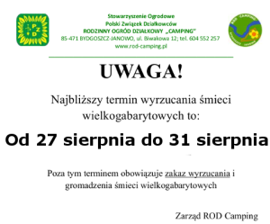 W związku z rozpoczynającą się budową zwracamy się z apelem o bieżące śledzenie zamieszczanych informacji. Zarząd nie jest w stanie fizycznie odpowiadać na zadawane pytania zważywszy, że działek na naszym terenie mamy 128. Dlatego też konieczne jest bieżące czytanie: wpisów na naszej stronie, otrzymanych maili, a także komunikatów zamieszczanych na obu ogrodowych tablicach. Jeżeli są działkowcy nie korzystający z Internetu to prosimy sąsiadów tych osób o dostarczanie im zamieszczanych informacji. Ponadto konieczność jeszcze większego zaangażowania w rozpoczętą inwestycje nie pozwala już na szybkie załatwianie drobniejszych, bieżących spraw poza tymi ,które wynikają z obowiązków nałożonych przez instytucje i obowiązujących przepisów prawa. Zarząd ROD Camping