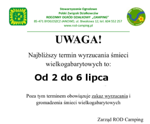 Wyrzucając wielkogabaryty z elementami szkła takie jak miedzy innymi : stoliki, lustra, okna, drzwi – prosimy koniecznie wcześniej wymontować te elementy szklane i włożyć do pojemnika Szkło. Niestety, ale ProNatura jak widać na zdjęciu, nie odebrała nam tych śmieci co niestety ale rodzi problem i dodatkową pracę gospodarza. Prosimy o zastosowanie się do powyższego. Zarząd ROD Camping